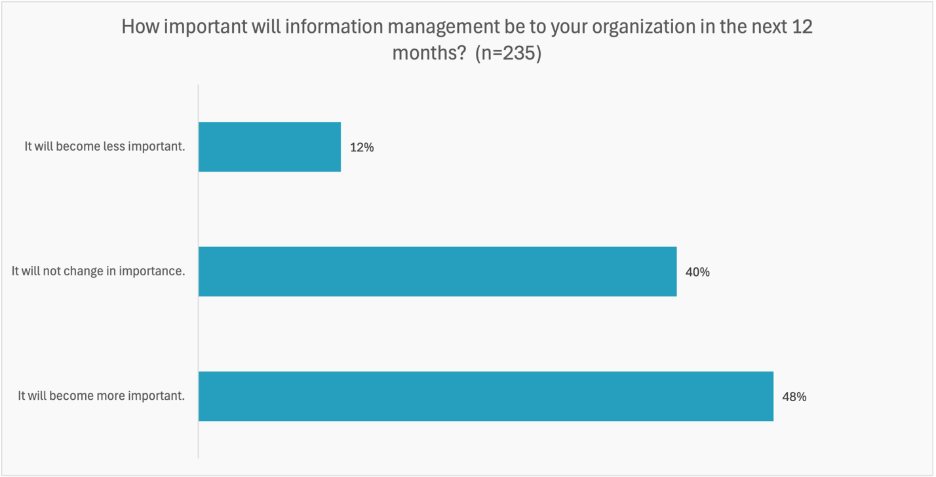 When we looked at how practitioners view information management's future importance, we found a notable shift. In 2024, 72% of respondents believed IM would become more important in the next 12 months. In 2025, that number dropped to 48%. At first glance, that might look like a warning sign. I don't think it is.